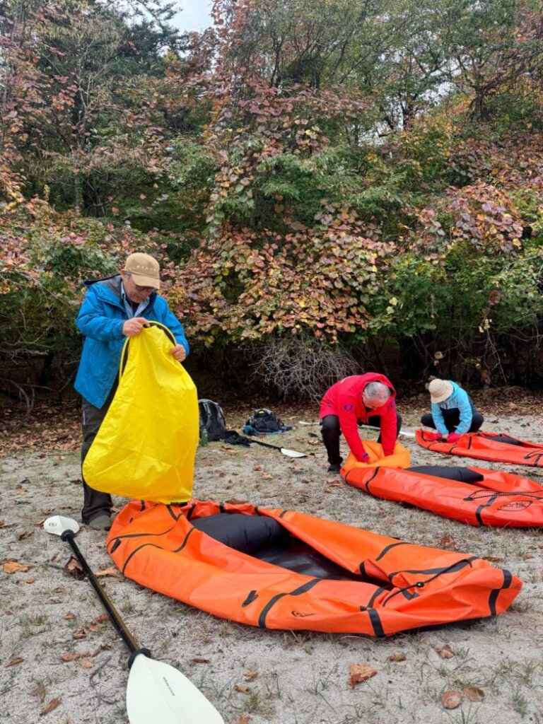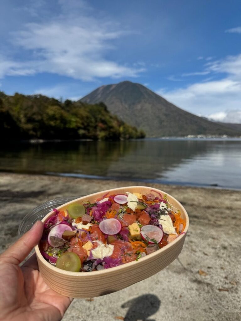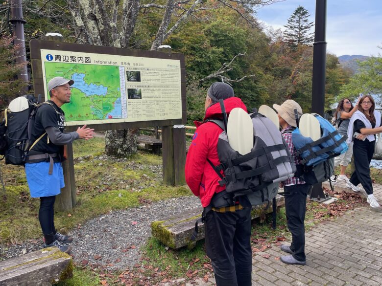 先週のツアーでは、歌ヶ浜の駐車場から旧英国大使館やイタリア大使館別荘記念館を抜け、ブナの自然林を進んだ狸窪先の砂浜までの約2kmを2時間かけてのんびりとハイキング。着いた砂浜で雄大な男体山を眼前に地元フランス料理店のシェフが手掛けた特選ランチを頬張りまったり。コーヒータイムの後、背負ってきたパックラフトに空気を入れていざ湖上へと乗り出しました!
