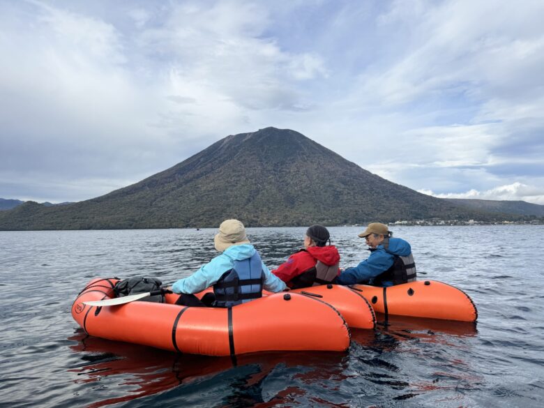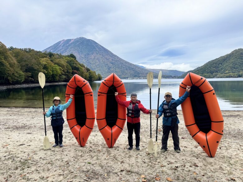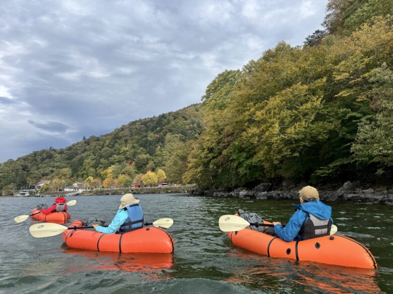 心地よい湖面の波に揺られながら眺める男体山はところどころ黄色や赤色に染まり始め、とても素敵な秋の始まりを感じることができました。こうしたのんびりと自然を楽しむアイテムとしてパックラフトは本当にピッタリ。