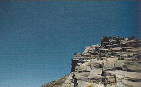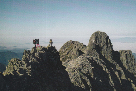 鎖場の急な下降。岩場のトラバース。高感度のあるナイフエッジ。