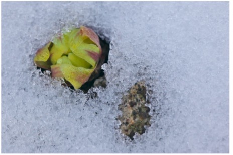 と、冬の真っ只中といった様相ですが、降り積もった雪の下では、新しい植物が早くも芽生えているのです。